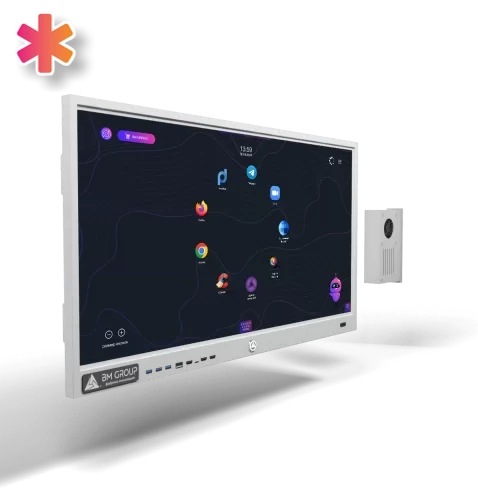 Многофункциональная панель в простом и современном дизайне не занимает много места, крепится на стену или на мобильную стойку на колесиках с фиксаторами. Это прекрасное решение для музеев, выставочных центров, образовательных учреждений (школ, колледжей, вузов и т.д.). Оболочка Aura работает с презентациями и всеми офисными приложениями.