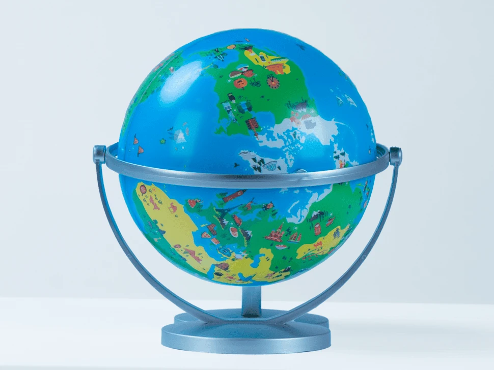 Это современная и умная версия глобуса, дополненная 3D объектами, которые ребенок сможет увидеть, направив на него камеру умного устройства.