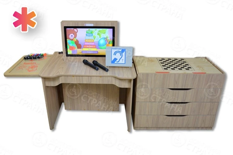 В комплектацию входит: планшет на подъемном механизме, отсек для работы с мелкой моторикой с двумя видами песка и пресс – формы. Есть деревянные развивающие тренажеры для психологического развития.