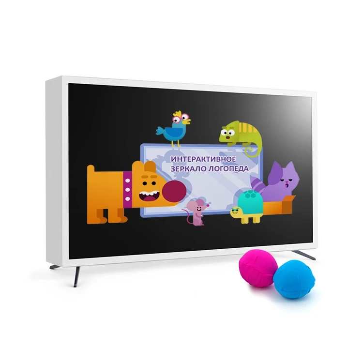 Интерактивное зеркало логопеда – это современный тренажер, который представляет собой специальный зеркальный монитор и компьютерную программу. На экран монитора можно выводить любые изображения и видео, а зеркальное покрытие позволяет ребенку видеть свое отражение, как и в обычном зеркале.