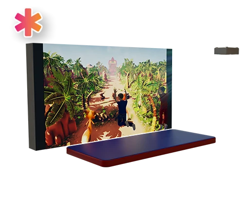 - На стену проецируется яркая, динамичная игра с бегущим персонажем и множеством препятствий. Задача игрока — не просто прыгать, а реагировать, мыслить стратегически и управлять героем движениями всего тела. Чтобы победить, нужно: Прыгать через возникающие барьеры.