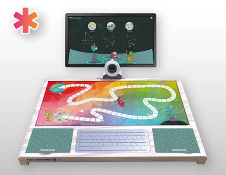 Интерактивный стол с уникальным дизайном MultiMind (Мультиминд) стимулирует групповые занятия и поощряет детей к командной работе. Стол оснащен удобной клавиатурой и двумя пультами управления, а так же камерой для распознавания различных дидактических материалов и действий детей. - Рабочие коврики