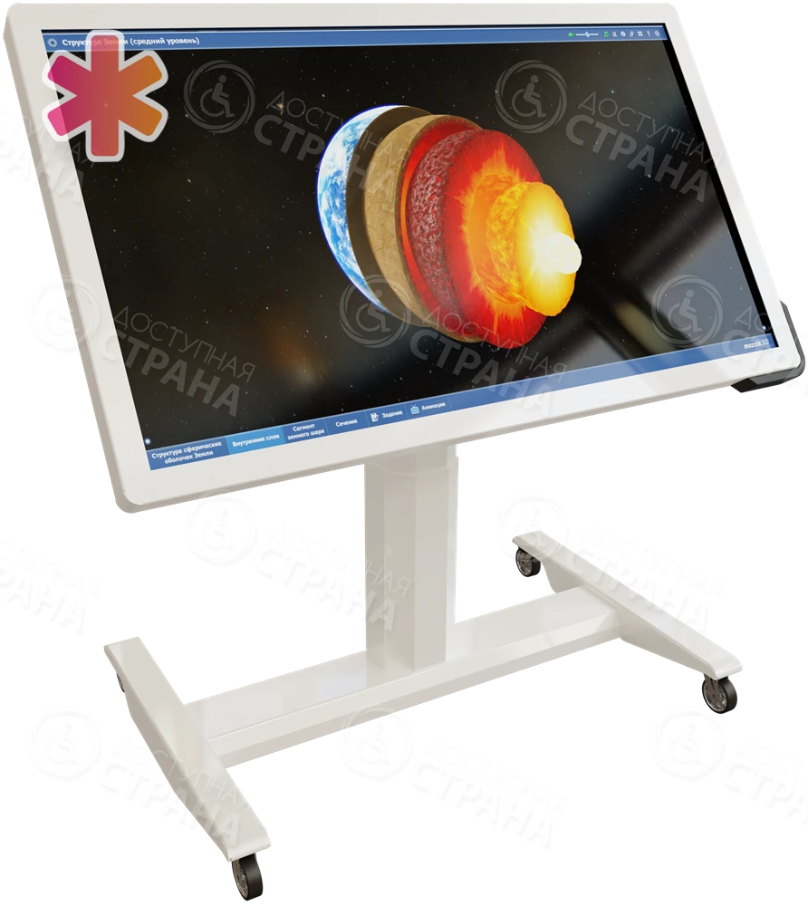 Программно-аппаратный комплекс 2 в 1 (панель и стол) для школ и библиотек оснащен колесами, поэтому его легко можно перемещать в пространстве. Угол наклона панели регулируется в пределах 90 градусов, изменяется высота экрана от 27 см до 55 см. В комплекте с оборудованием.