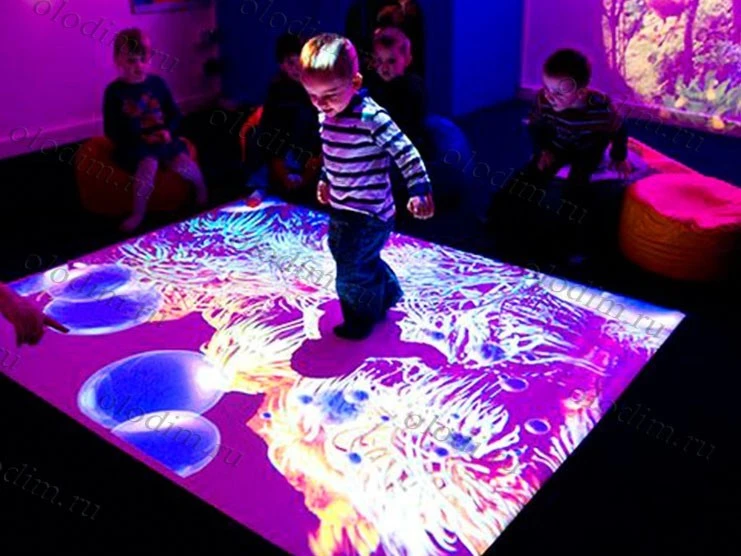 Интерактивный пол – это напольная проекция, реагирующая на движения. С ним, пол в детской комнате превращается, либо в поверхность океана, в которой плавают рыбки, либо в огромное футбольное поле, на котором можно поиграть с мячом, либо в летний луг с бабочками..., при этом, изображение моментально реагирует на движение детей.
