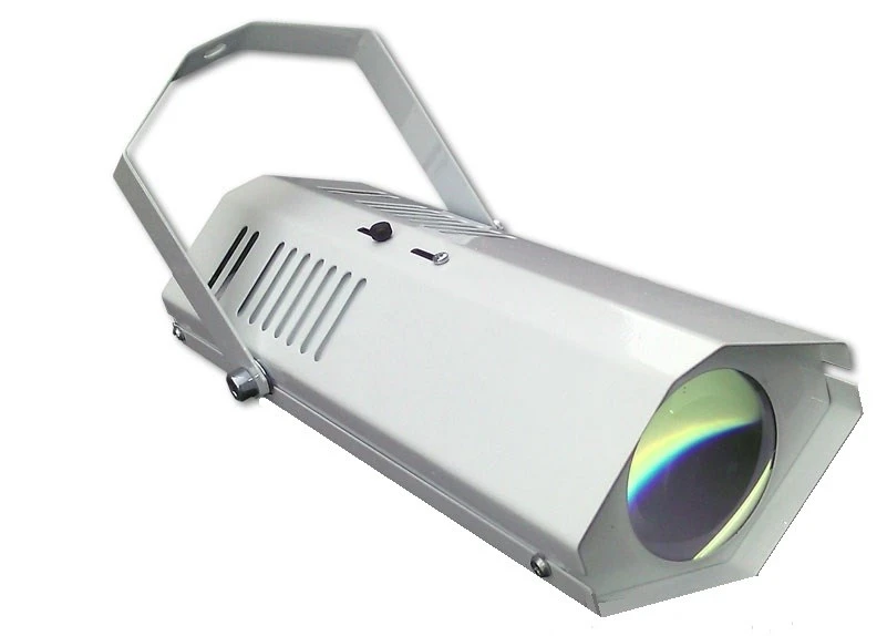 Миниатюрная световая пушка белого или 5-ти цветного луча - профессиональный источник света для работы зеркального шара. Съемная насадка с цветными полосками. Набор диафрагм для изменения ширины луча. Может использоваться, как проектор несложных трафаретов для обучения и развлечения детей.