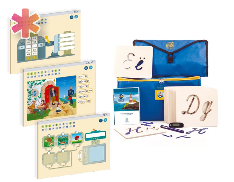 Комплект: программное обеспечение «Море словесности», электронная ручка, набор «Тактильный алфавит», набор элементов букв, методическое пособие «Методика профилактики и коррекции четырёх видов дисграфии», руководство пользователя, фирменная сумка.