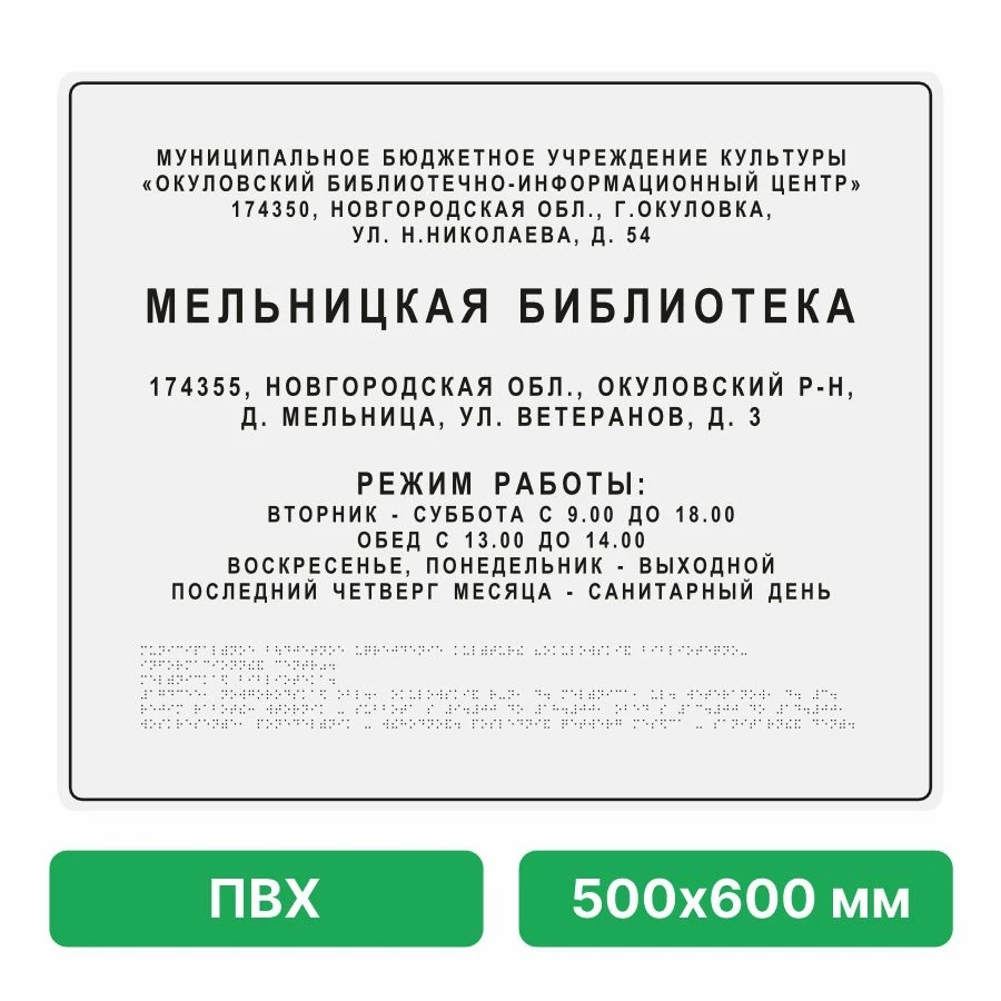 Самый популярный формат. Рекомендуем для поликлиник, библиотек, МФЦ и административных зданий. На нем свободно помещаются: название, адрес, режим работы и шрифт Брайля. - 500х600 мм