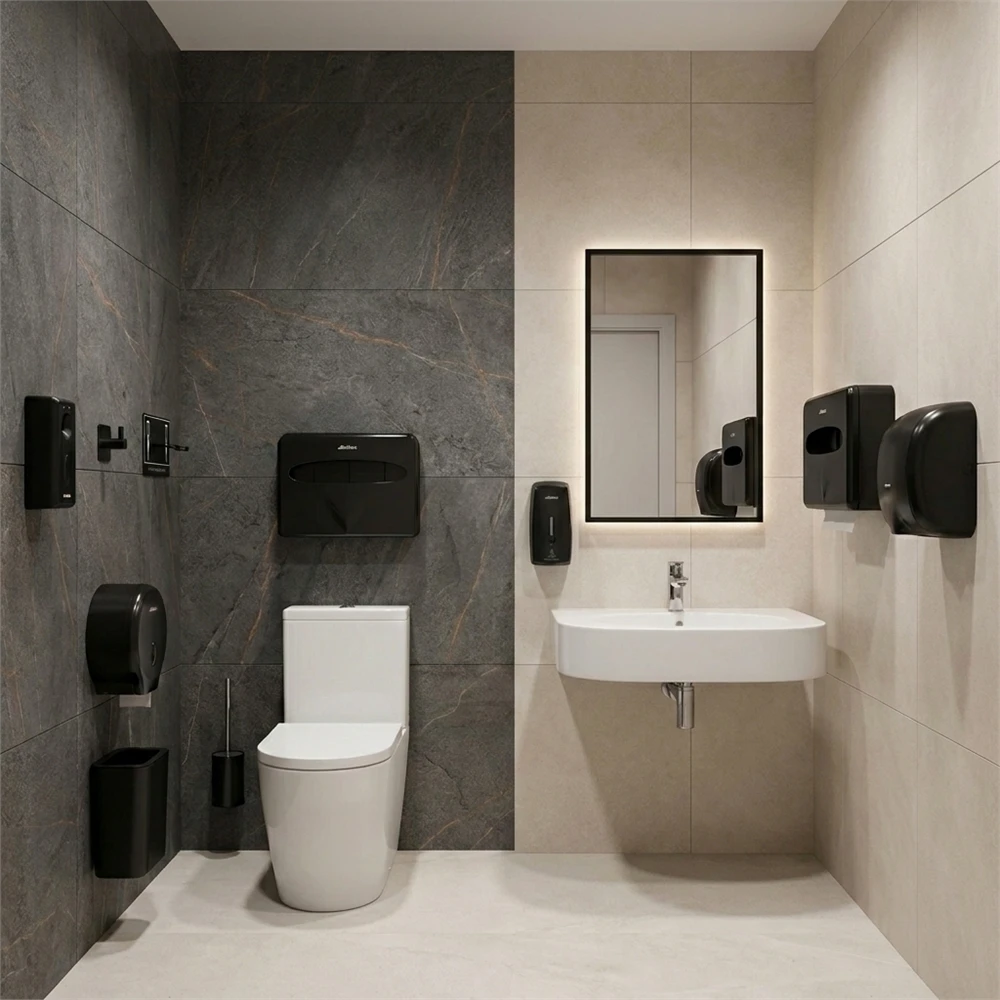 Комплект аксессуаров в черном цвете разработан для оснащения доступных санузлов с учетом требований современной архитектуры и стандартов безбарьерной среды. Решение сочетает функциональность для МГН и актуальный дизайн для общественных и коммерческих пространств.