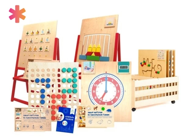 - Набор по лексическим темам из 160 деревянных карточек с изображениями по основным лексическим темам: мебель, одежда, посуда, транспорт, специальный транспорт, семья, бытовая техника, деревья, сказки. В набор входят элементы для крепления карточек к панелям.
