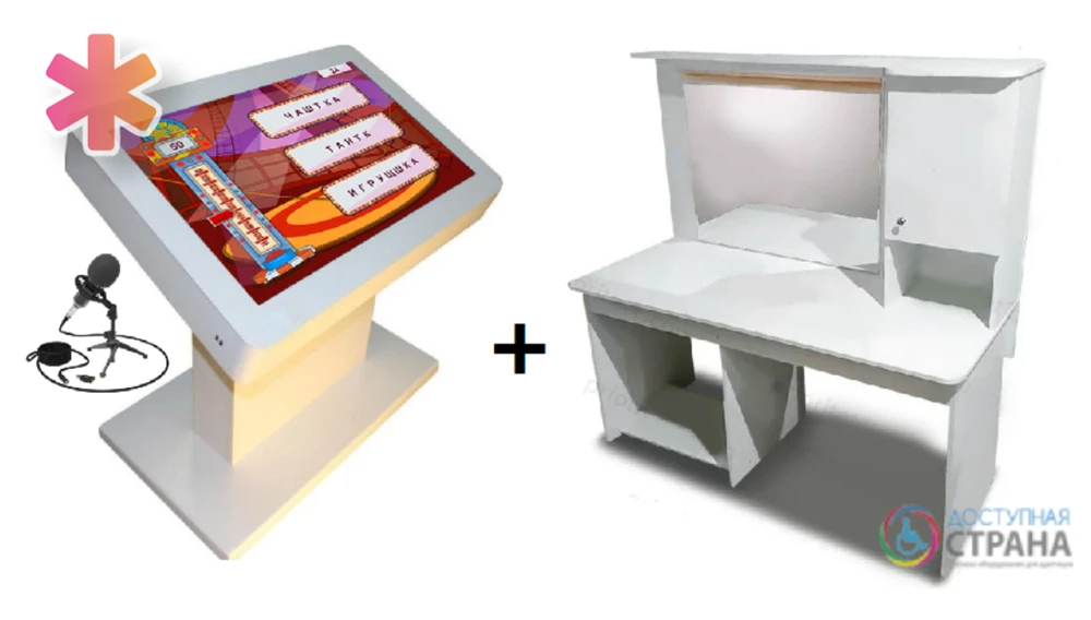 Комплект состоит из двух обособленных элементов: интерактивного стола для ученика (интерактивный стол логопеда, психолога и педагога 3в1) и стола/рабочего места педагога (стол логопеда с зеркалом регулируемый Logo Profi)
