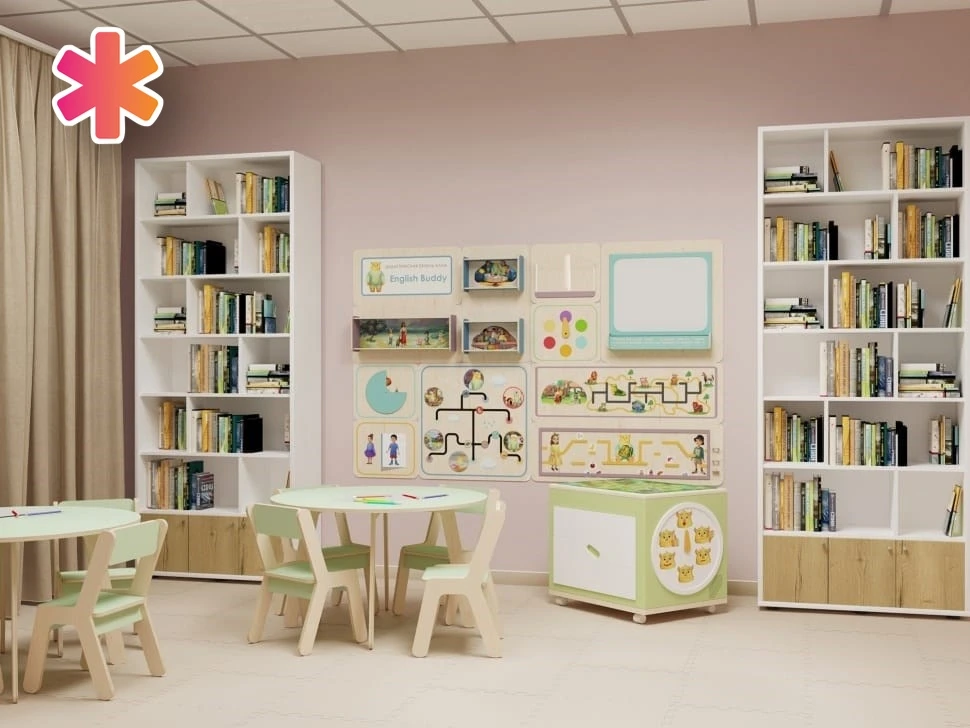 Комплект оборудования для кабинета английского языка рассчитан на занятия в группе 2-8 человек. Он включает рабочий стол специалиста, ПК с периферийными устройствами, 2 детских круглых стола и 8 стульчиков. Для хранения методической и художественной литературы есть 4 открытых стеллажа. Стены украшают декоративные панели, магнитно-маркерная доска для традиционной работы на уроке и дидактическая настенная панель English Buddy для визуального запоминания и закрепления знаний в дидактических играх.