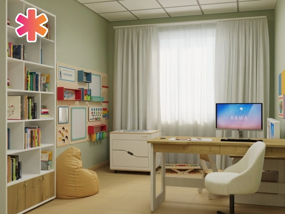 Готовый комплект содержит: стол психолога-дефектолога, рабочий стол для детей, компьютер специалиста с программным обеспечением для психологов «Профиль психолога», интерактивную сенсорную панель с набором общеразвивающих программ для дошкольников, дидактическую панель «Гармония», кресла-мешки, набор корпусной мебели, нейротренажеры, методические материалы, обучающие пособия и многое другое.