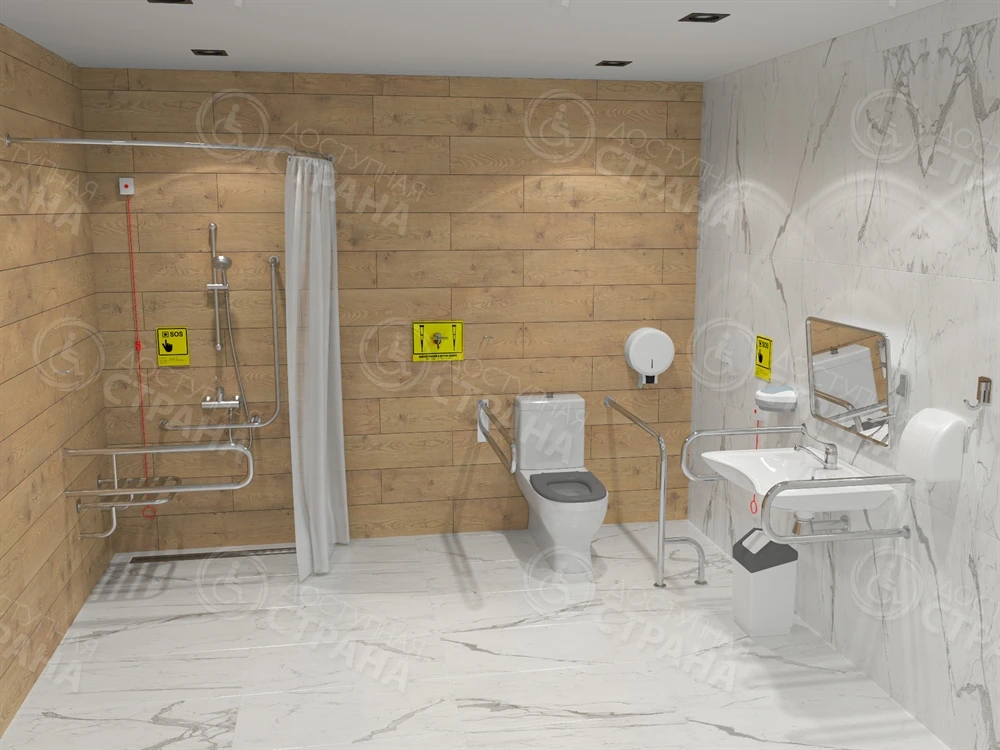 В соответствии с действующими нормами СП 59.13330.2020 санузел должен быть адаптирован для инвалидов специализированным оборудованием (все необходимое учтено в наборе!).