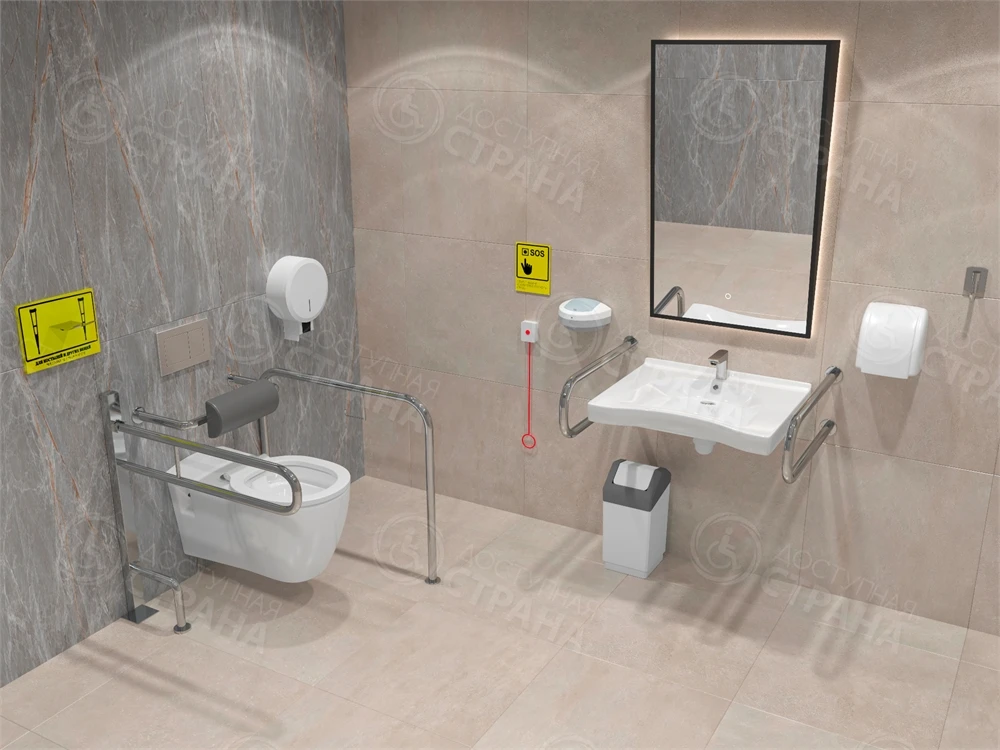 В соответствии с действующими нормами СП 59.13330.2020 санузел должен быть адаптирован для инвалидов специализированным оборудованием (все необходимое учтено в наборе!).