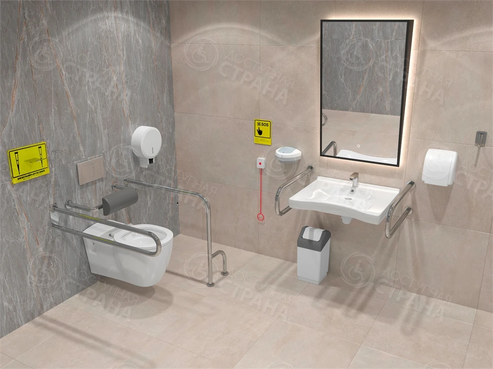 - Бесконтактный диспенсер для туалетной бумаги, дозатор для мыла, сушилку, крючок желательно размещать на высоте 90см - чтобы людям с ограниченными возможностями на инвалидной коляске было удобно пользоваться.