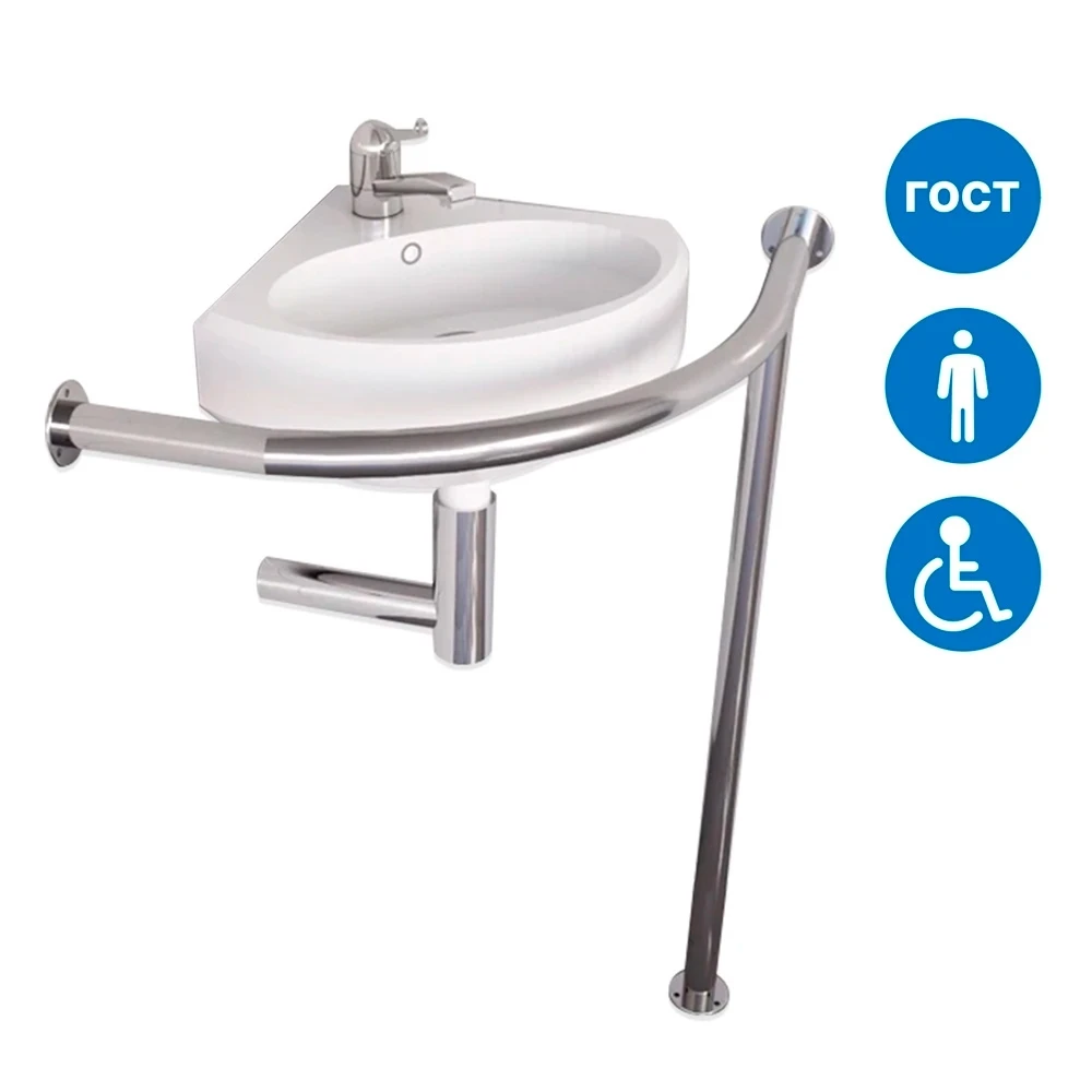 Комплект: Раковина угловая для инвалидов DS IF35 со смесителем DS3 и поручень полукруглый на стойке (арт. 2514, 5709, П4824-у)