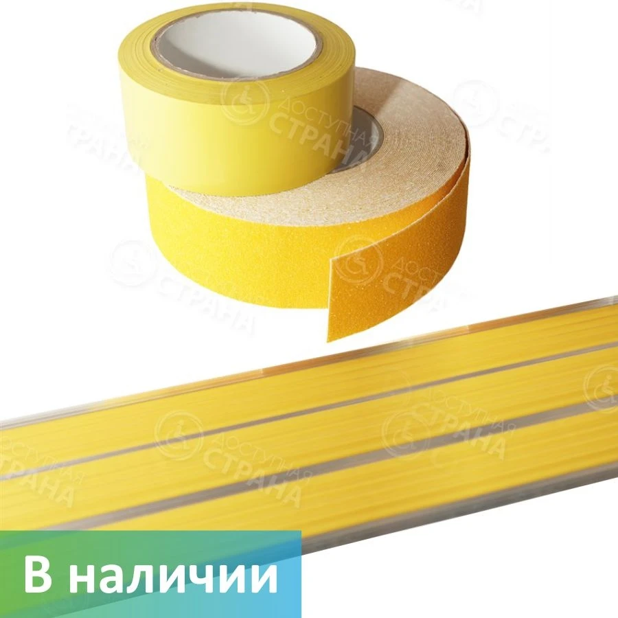Противоскользящая абразивная самоклеящаяся наклейка (полоса, лента) контрастного желтого цвета, применяется для маркировки ступеней внутри помещения и создания противоскользящего эффекта, также может быть использована для разметки путей следования МГН. Лента имеет шероховатую поверхность "с крошкой", наподобие наждачки, эффективно препятствует скольжению, защищая человека от падения. На обратной стороне ленты нанесен долговечный акриловый клей, позволяющий надежно зафиксировать ленту практически на любых поверхностях - гладкий бетон, мрамор, гранит и керамогранит, керамическая плитка, ламинированный паркет, массивный паркет, металл, стекло, линолеум, дерево и т. д.