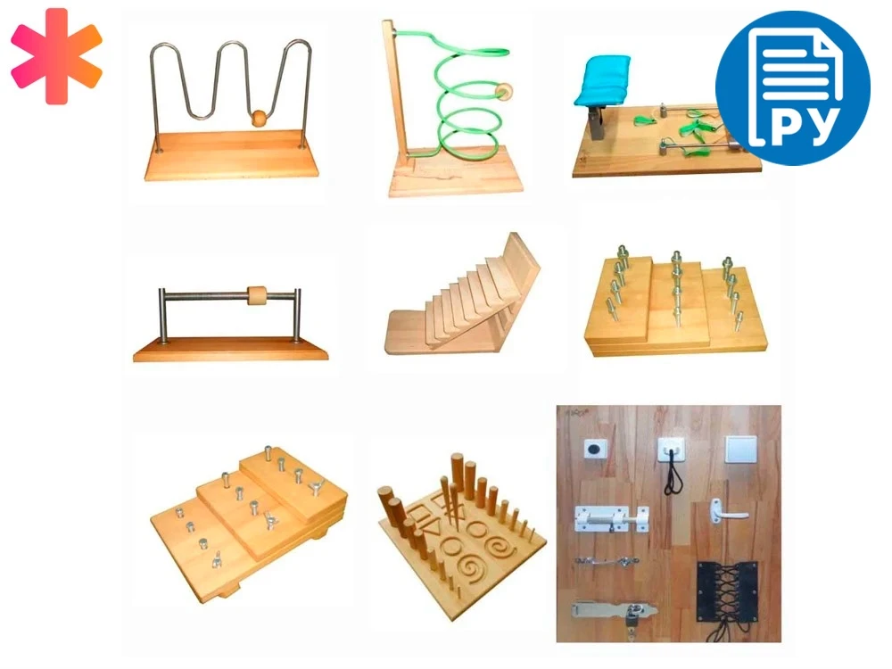 Панель настенная с тренажерами, используется в эрготерапии, в процессе восстановления утраченных или ослабленных функций верхних конечностей. Основа панели изготовлена из натурального бука, на панели расположены тренажеры, имитирующие повседневные движения рук в процессе бытовой деятельности. Методика упражнений подбирается индивидуально, исходя из разработанной программы реабилитации и развития функций. На панели расположены тренажер для имитации движений рук в бытовой деятельности, включающий различные бытовые предметы (дверной звонок, оконная ручка, шпингалет и т.д.) и тренажер "Шнуровка".