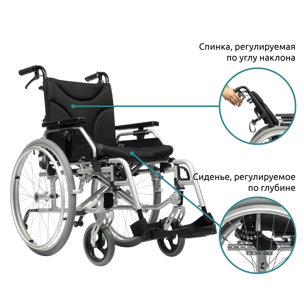 - Спинка, регулируемая по углу наклона с помощью рычагов на ручках для сопровождающего лица