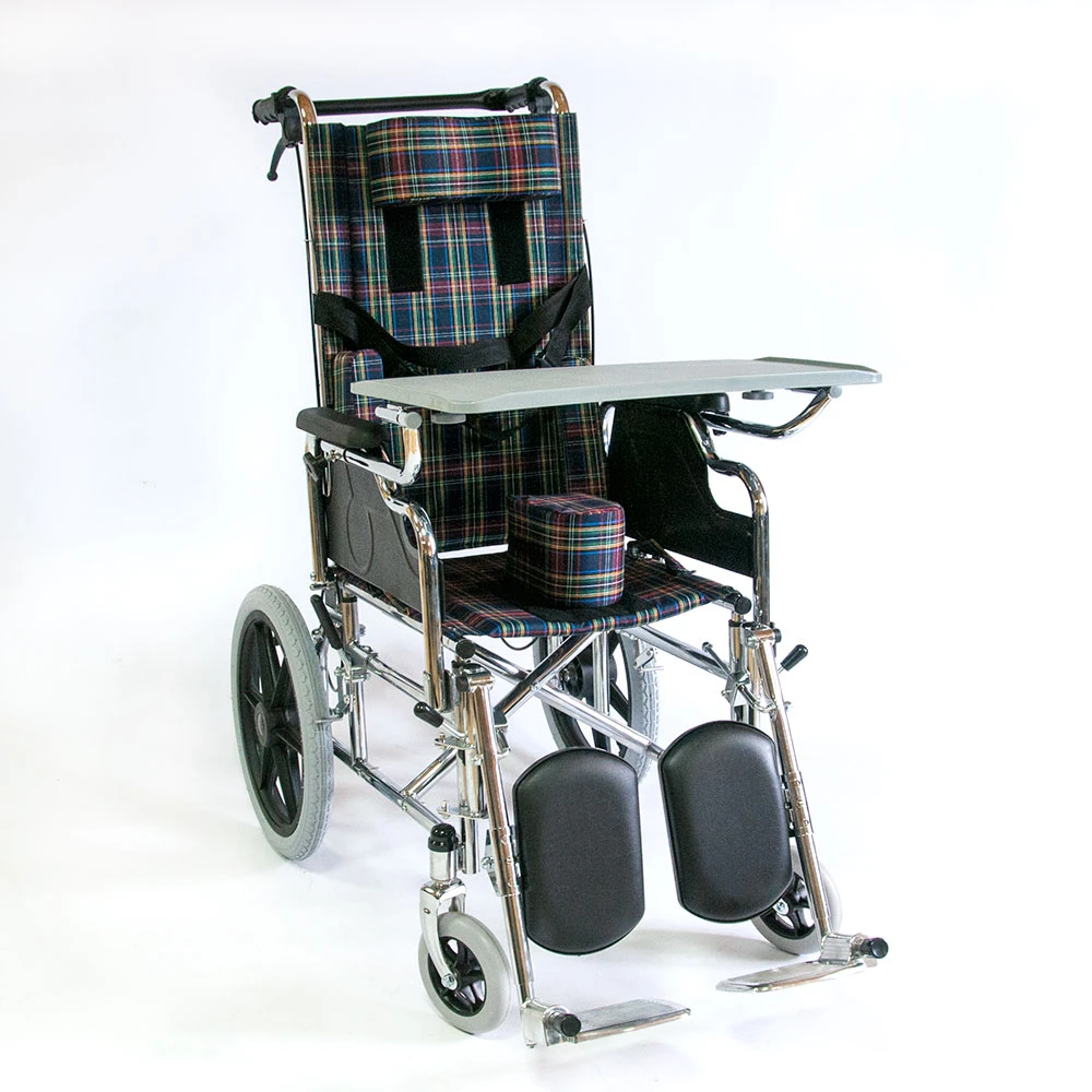 Конструкция складная, рама выполнена из стали с хромовым покрытием; коляска оборудована откидными подлокотниками с мягкими накладками, съемным столиком. Абдуктор, подголовник и боковые фиксаторы для туловища крепятся к креслу с помощью липучек.
