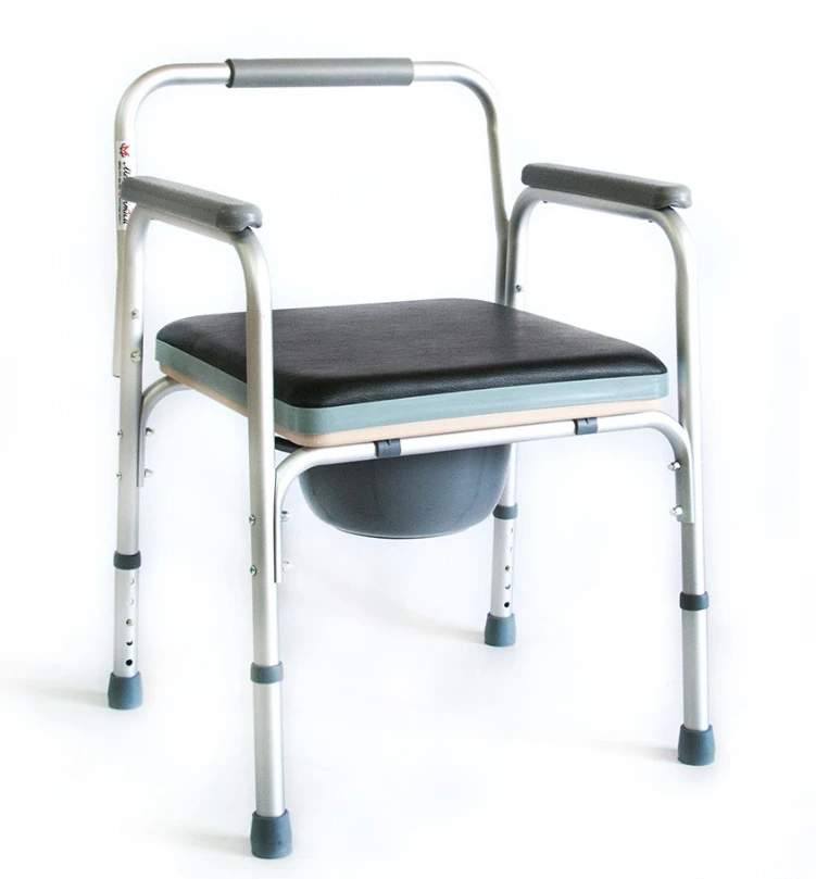 Стульчак выполнен из прочного, легко моющегося пластика и оборудован санитарной емкостью с крышкой. Емкость удобно переносится за ручку. Рама выполнена из анодированного алюминия и не подвергается коррозии. Кресло регулируется по высоте с помощью кнопочных фиксаторов на ножках конструкции (5 положений регулировки с шагом в 2,5 см). Ножки кресла оснащены противоскользящими наконечниками, не оставляющими следов на полу.