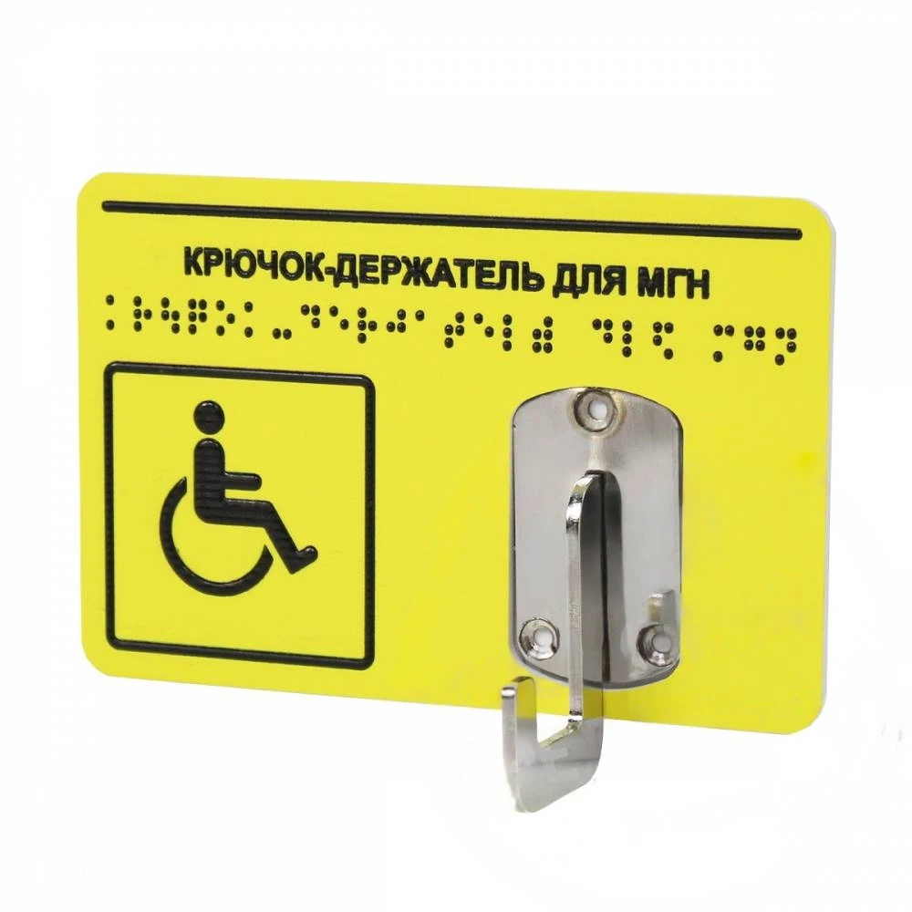Изделие выдерживают нагрузку до 16 кг. Во избежание травмирования пользователей края тактильной таблички обработаны, а углы скруглены, все грани крючка не имеют острых окончаний и стыков. Крючки держатели для одежды, костылей и других принадлежностей доступные для маломобильных групп населения (МГН) размещаются не выше 1.3 м.