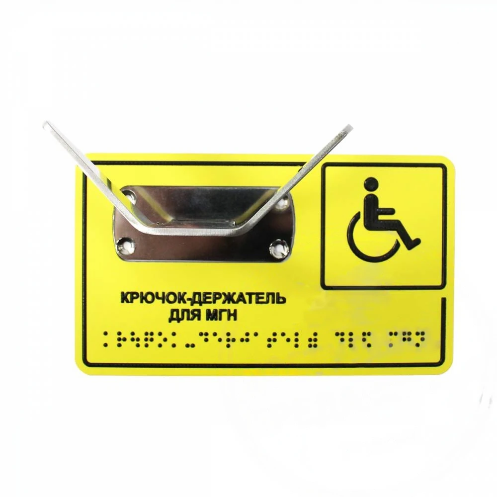 Крючок для костылей, трости, одежды, полотенец из нержавеющей стали представляет собой крючок из нержавеющей стали в виде двух направленных вверх рожков и инкрустированный в тактильную табличку из ПВХ. На контрастную тактильную табличку нанесена рельефная надпись с применением системы Брайля, нанесённая послойно-полимерным способом.