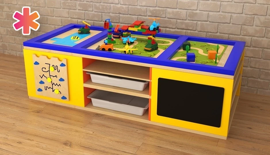 Ландшафтный стол очень удобен для групповых и индивидуальных развивающих занятий с детьми. Расположенные на поверхности стола локации помогут формированию у детей картины мира и отдельных его составляющих. Локации ограничены друг от друга бортиками. В полках стола можно хранить развивающие игры, предназначенные для развития разнообразных навыков у детей.