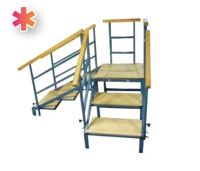 Лестница для обучения ходьбе «Я Могу!» состоит из платформы, двух съемных лестничных блоков, которые монтируются к платформе как прямо, так и под углом 90 градусов. Блоки отличаются количеством лесенок (2 и 3) и расстоянием между лесенками (высотой ступенек). Лестничные блоки и платформа снабжены поручнями с обеих сторон. Поручни регулируются по высоте.