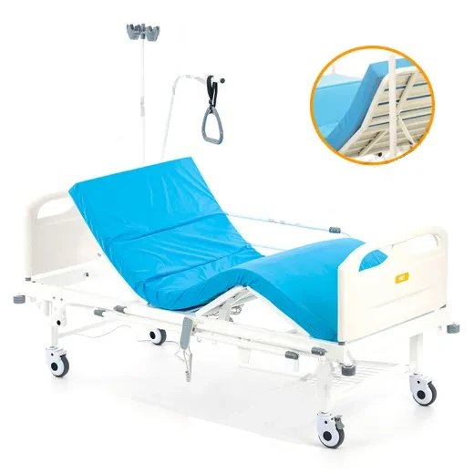 Медицинская Пяти секционная Функциональная Кровать производства РФ с дополнительным изломом спинной секции для большего комфорта пациента в положении сидя и независимыми электрическими регулировками бедренной и спинной секций.