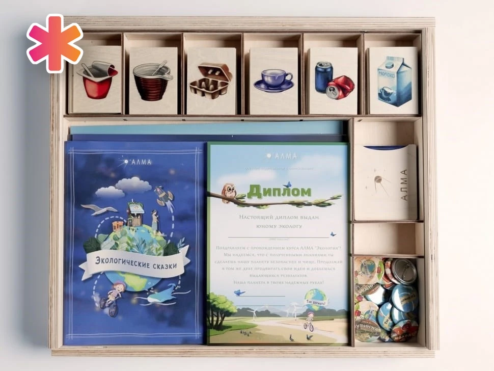 «Экология» — это программное обеспечение, мотивационные значки и дипломы «Юного эколога», сборник экологических авторских сказок, тематические плакаты, комплект деревянных контейнеров и игральных карточек для «сортировки мусора», карточки для проведения викторины.