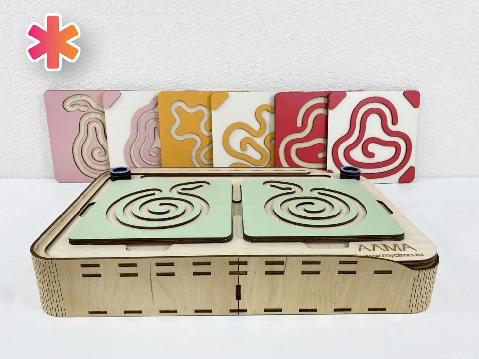 Это нейроигрушка для развития межполушарного взаимодействия. Состоит из коробки-основания и цветных лабиринтов-вкладышей. Два лабиринта с зеркально изображёнными картинками устанавливаются в пазы, и ребёнок проходит их с помощью специальных пальчиковых фишек.