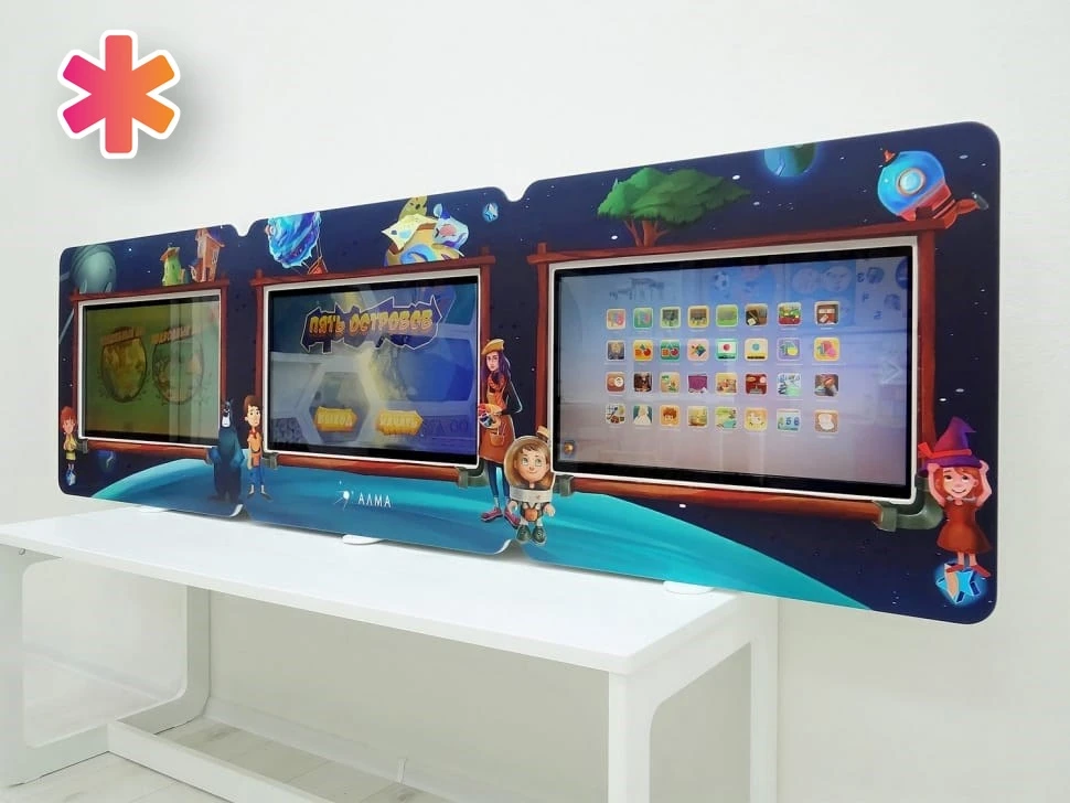 - Корпус для трёх интерактивных панелей, украшенный детскими картинками и персонажами из программного обеспечения.