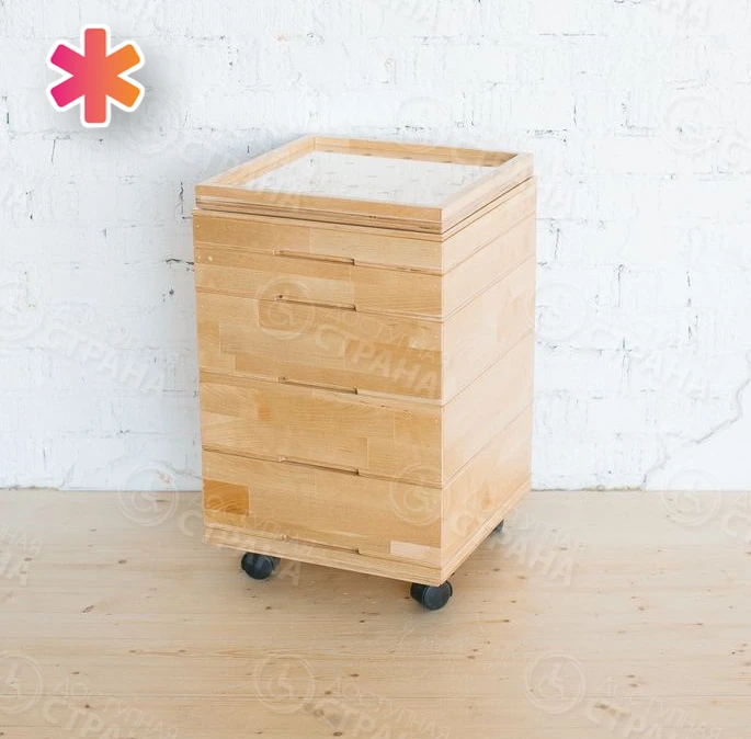 - Все детали хранятся в мобильной тумбочке с поворотными колесами. Она состоит из нескольких модулей, которые ставятся друг на друга.