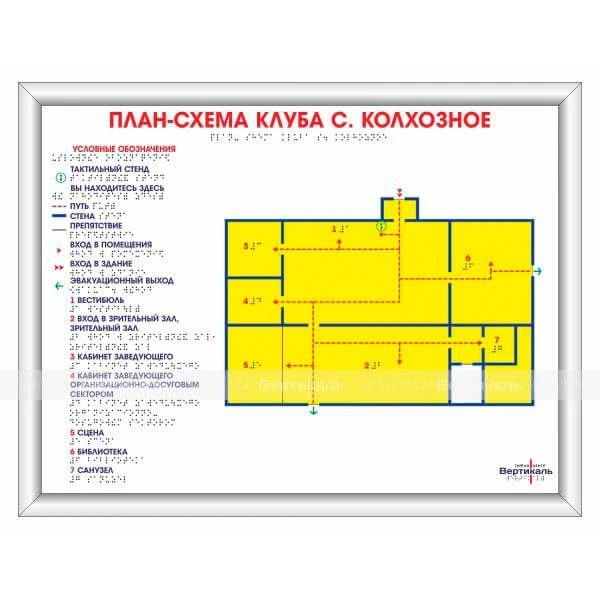 Мнемосхемы по системе Брайля являются важным элементом тактильной адаптации помещений для незрячих. Регламентируется нормативным документом СП 59.13330.2016. Выполнено по ГОСТ Р 56832-2015.