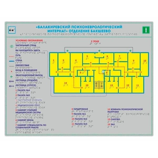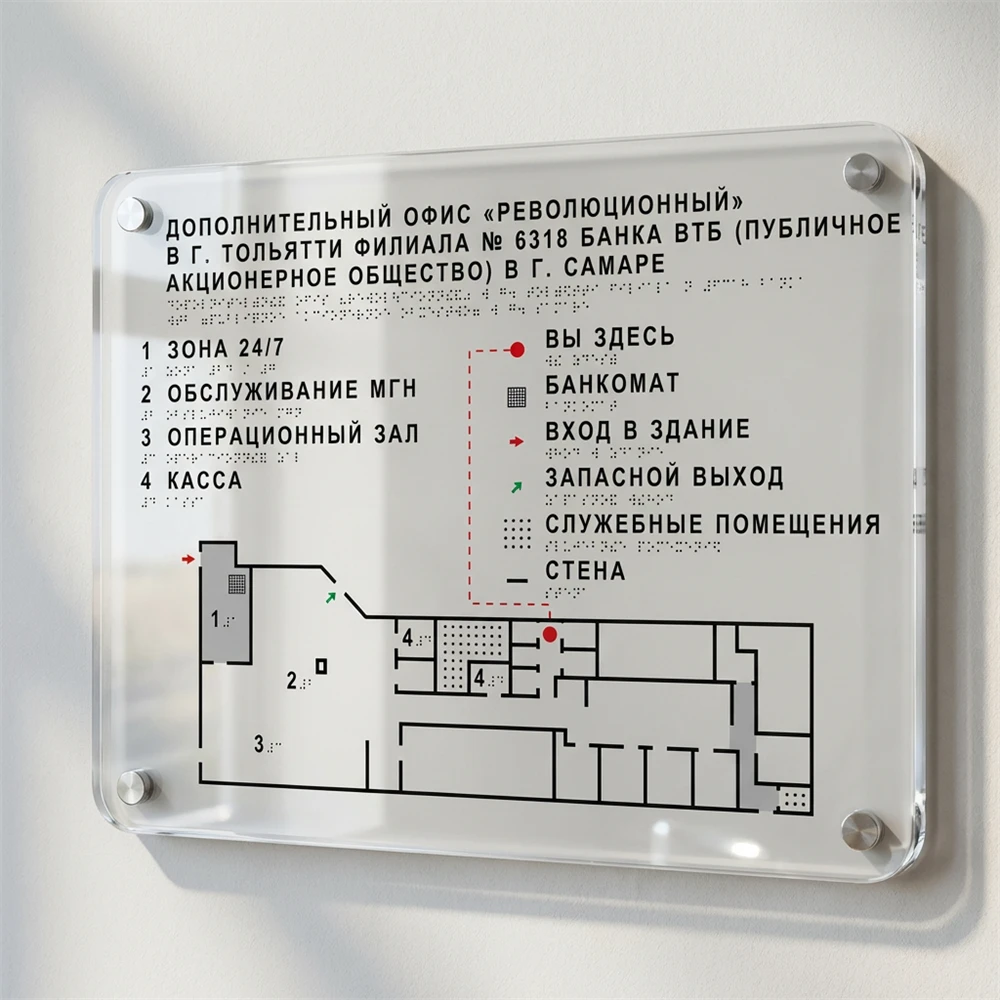 Мнемосхема тактильная полноцветная на основе оргстекла 8мм. Тактильная мнемосхема – это особенное тифлотехническое средство для пространственного ориентирования людей с ограничениями по зрению, выполненная с применением тифлографической схемы и текстовой информации, дублируемой по системе Брайля. Мнемосхема легко монтируется с помощью дистанционных держателей, что позволяет разместить её в любом, даже малогабаритном помещении.