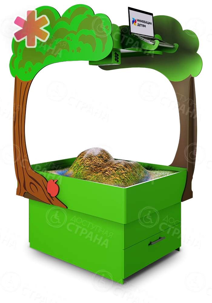 Интерактивная песочница — комплекс, в котором с помощью технологий дополненной реальности дети строят на песке свои миры с озёрами и горами, вулканами и долинами. Так дети изучают окружающий мир, географию, строение земли, цвета, фигуры, учатся ориентироваться в пространстве, развивают память, внимание и логику.