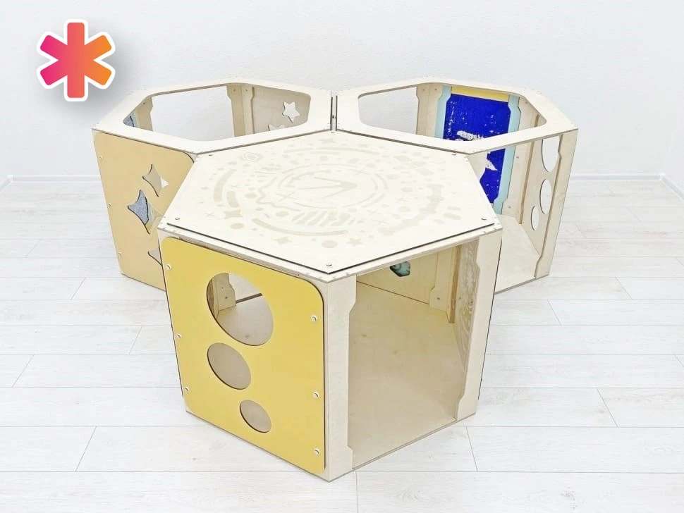Внутри модули украшены тактильными панелями для развития сенсорной чувствительности, а снаружи – лазерной гравировкой и фигурными окошками. Они идеально стыкуются между собой и позволяют конструировать из них замки и лабиринты для маленьких непосед.