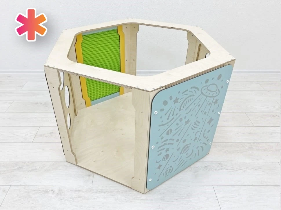 Внутри модули украшены тактильными панелями для развития сенсорной чувствительности, а снаружи – лазерной гравировкой и фигурными окошками. Они идеально стыкуются между собой и позволяют конструировать из них замки и лабиринты для маленьких непосед.