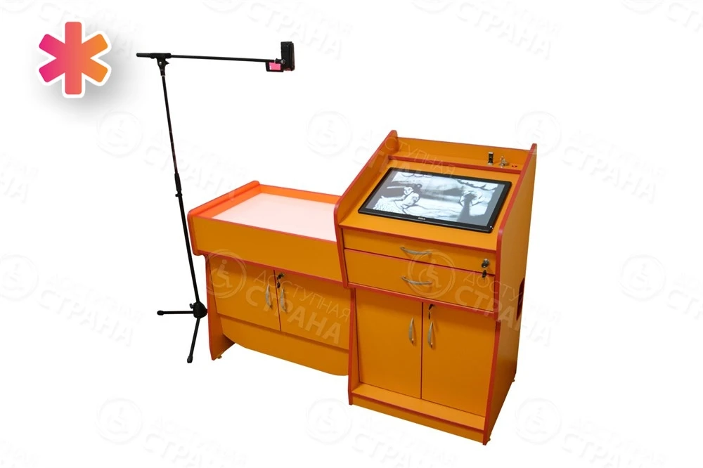 Преимуществом этого комплекса выступает вмонтированный в трибуну компьютер с веб камерой и сенсорным дисплеем, диагональю 21,5 дюйма - он поддерживает до 10 одновременных касаний. Камера с функцией ручной и автоматической фокусировки. Это помогает педагогу контролировать работу с ребенком.
