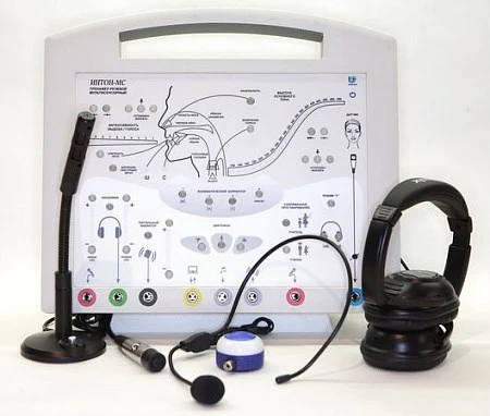 - Тренажер состоит из электронного блока со световыми шкалами и индикаторами, к которому подключаются микрофоны, наушники, датчик назальности и тактильный вибратор.