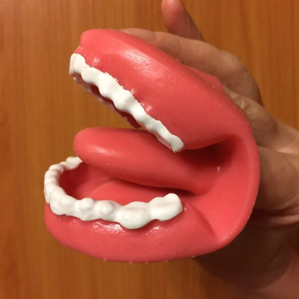 Этот муляж рта приятный на ощупь, легкий, компактный. Он сделает занятия по коррекции звукопроизношения доступными даже для самых маленьких пациентов. Муляж рта предоставляет возможность демонстрировать степень раскрытия рта, положение языка внутри полости рта во время артикуляции различных групп звуков. В отличие от аналогов, на муляже хорошо видны зубы и детали верхнего и нижнего неба. Ребенок может сам манипулировать этим муляжом. Его размеры позволяют ребенку вставить пальчики в кармашки и имитировать движения челюстями и языком.