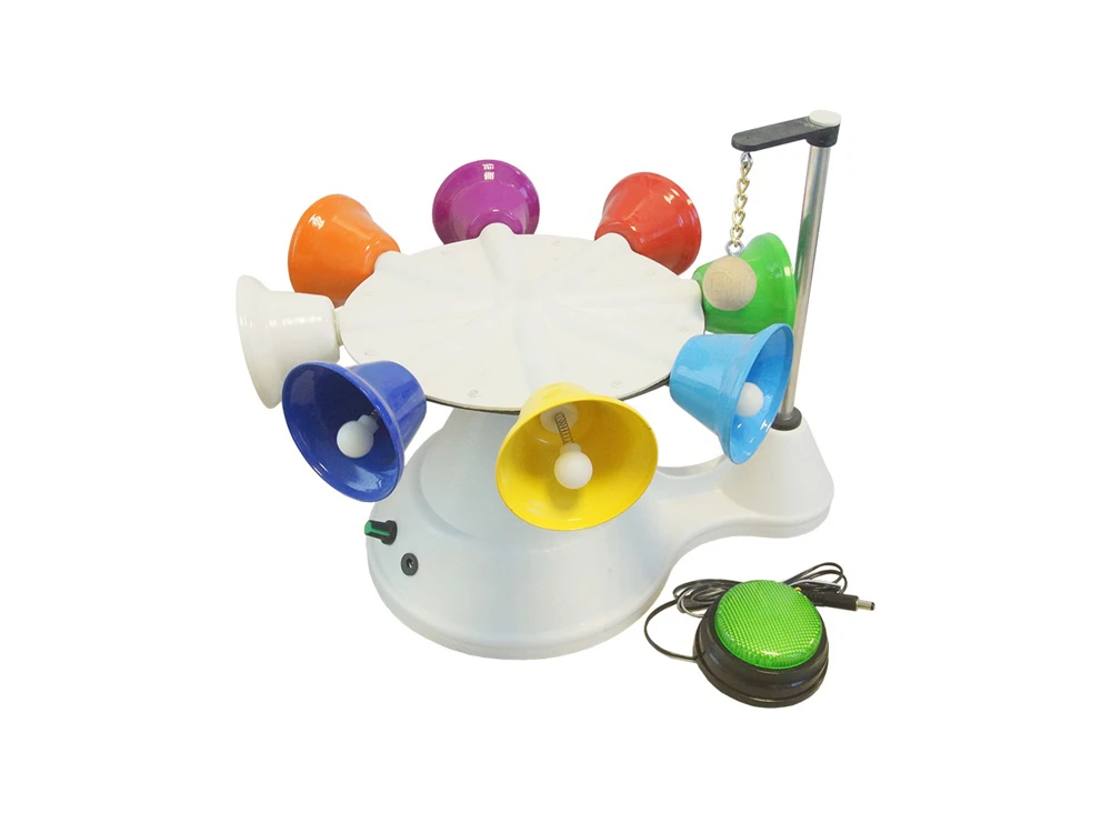 Музыкальная карусель – это механическое устройство, на корпусе которого расположены приборы управления (кнопка активации, регулятор скорости вращения, разъем для подключения дистанционной кнопки). На верхней части карусели, расположен вращающийся элемент на котором расположены съемные колокольчики в количестве 8шт. Сбоку есть вертикальный шток, на выносном кронштейне которого закреплен шар, при вращении площадки с колокольчиками он ударяется о корпус колокола, который в свою очередь издает звонкую мелодию. Все колокольчики имеют разный окрас, а также разную мелодию звучания. В комплект входит дистанционная кнопка.