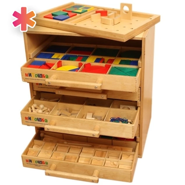 В комплект входит дополнительный ящик с доской-основой и двумя рамками для работы. Все ящики размещаются в мобильном стеллаже. В комплект также входят методические рекомендации.
