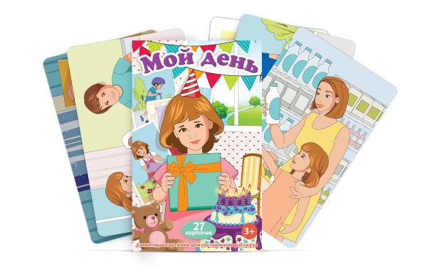 В комплекте 27 сюжетных картинок для составления рассказа. На карточках изображены занятия, которые ребенок делает в течение дня: завтракает, играет, гуляет с родителями, спит и другие действия.