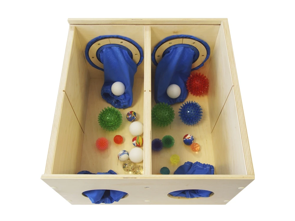 Сенсорный ящик представляет собой коробку, со сдвижной крышкой, на противоположных торцах имеются по 2 круглых отверстия, которые снабжены тканевыми рукавами. Внутри ящик имеет съемные перегородки, которые можно устанавливать или вынимать в зависимости от учебного процесса. Все края обработаны и травмобезопасны. В комплекте имеются методические руководства, набор тактильных шариков разной фактуры и размеров в количестве 24 шт.