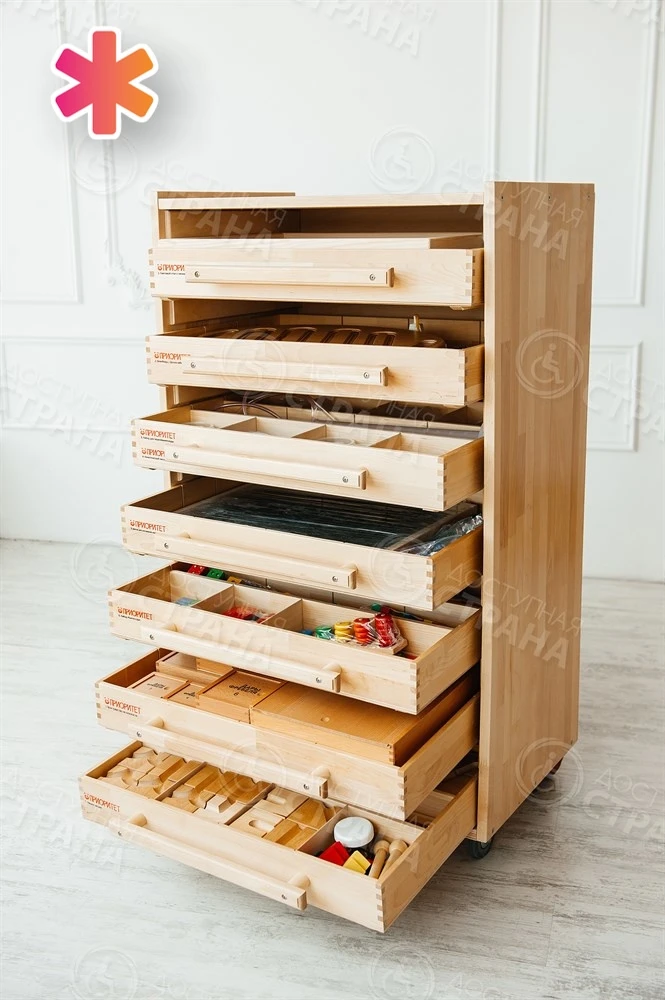 - Удобная система хранения: мобильная тумба на поворотных колесах и выдвижные ящики для каждого модуля.