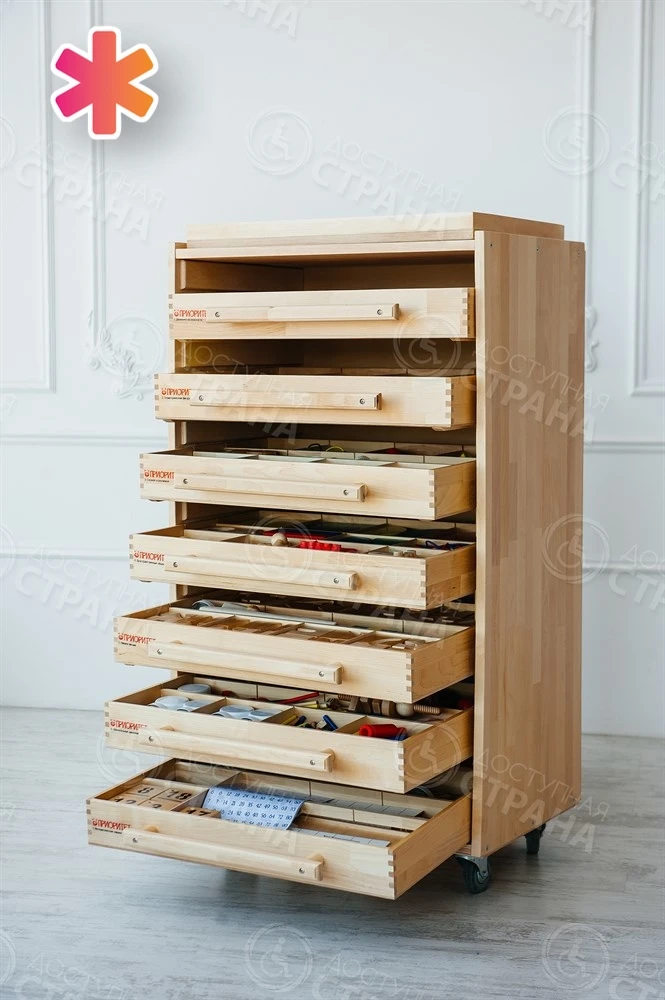 Набор представляет собой мобильный стеллаж, изготовленный из натурального дерева. В нем 7 чемоданов с игровыми комплектами и 2 доски-основы, на которых можно раскладывать игры.