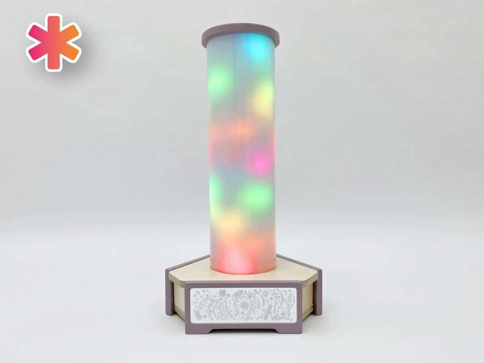 «Лампус» состоит из жёсткого основания, куда прячется блок питания и контроллер, и матового акрилового цилиндра, который и является светящейся поверхностью. Основание колонны изготовлено из берёзовой фанеры в сочетании с мдф, покрытым эмалью и жаропрочным лаком Renner на водной основе. Лак защищает изделие от загрязнения и истирания. Вставки изготовлены из безопасного акрилового зеркала с гравировкой.