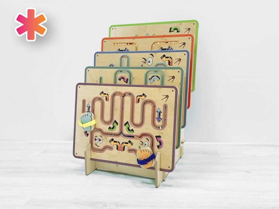 В комплекте идёт пять платформ-лабиринтов и подставка для них. Можно повесить все сразу, если позволяет помещение, можно только одну — и заменять платформы по мере надобности. В методическом пособии собраны варианты занятий, которые можно проводить с детьми.